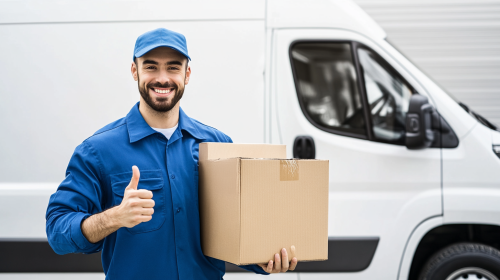 a courier delivery guy is pressing the droorbel button as he stands with a brown box package to deliver to your front door. He is facing the camera. hyper realistic. bright sunny daylight. ultra realistic photo quality