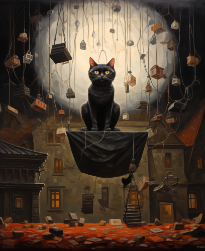 an art cartoon of one large black cat ::4 with many guns ::2 shooting at soviet police, suspended/hanging from a chandelier ::4 Ernie Barnes style, Jean-Joseph Benjamin-Constant style, Palekh technique ::0.5 in the style of fantastical contraptions, story illustrations, --no birds --no fish --ar 9:11