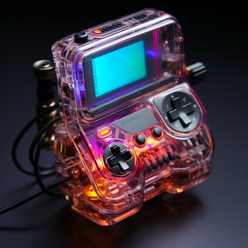 game boy console fill up the picture, aerial view, transparent shell, details of chips and parts, colorful and neon fashion - - ar 27:12 --s 750 --style raw