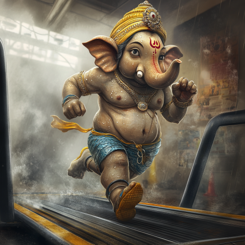 fit lord Ganesh wearing sportswear and smartwatch running on a treadmill. He is wearing branded running shoes. He is seen from the side. There is a smartwatch on his wrist that showshows his heartrate. He is drenched in sweat.