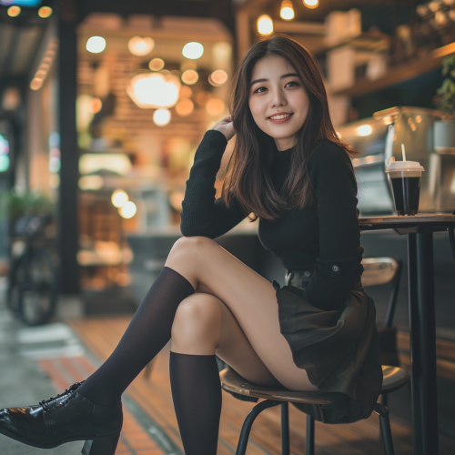 A woman is sitting on a chair, a beautiful 18yo fashion model-like Japanese slender woman with a smile and beautiful legs is wearing casual clothes and a miniskirt, beautiful legs, knees and calves, her legs are not crossed. The woman has big brown eyes and a high nose, is wearing the latest perfect dark makeup, has a bewitching smile, is drinking coffee on a cafe terrace at night in Osaka, and is looking up from directly below with a wide-angle lens. Full body shot, dramatic narrative cinematography, --style raw --v 6.0