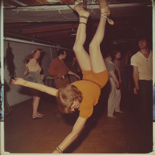 Angela Merkel as 20 year old woman on a breakdance contest party. 1970s polaroid. --v 6.0