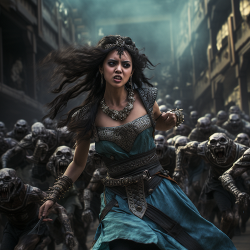 Photo of queen cleopatra chased by a horde of zombie in beijing city centre. Photo realistic, 8k, ultra hd, highly detailed, hyperrealism