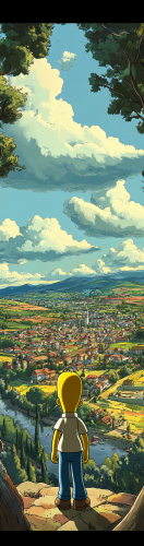Epic poster. In the background, the town of Springfield from the Simpsons cartoon. In the centre, Homer Simpson stands from behind. The background is infused with shades of yellow, green, blue and grey to capture the atmosphere of Springfield, the town from The Simpsons cartoon. The Simpsons cartoon-style poster --ar 5:19