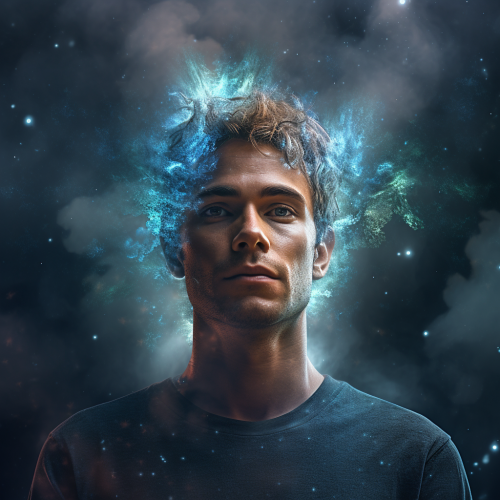 A cosmic-themed artwork showcasing a deep blue starry sky, distant planets, and a vibrant purple nebula. The foreground features a glowing event planner figure, softly lit with green and lime highlights, holding floating holographic invitations. The figure and elements are distinctly contrasted from the rich cosmic background. The slogan "Creating moments that resonate deeply" is integrated subtly as a glowing text in the nebula’s curve. Created Using: digital painting techniques, sci-fi aesthetics, intricate details, dynamic lighting, hd quality, surreal atmosphere, bold contrasts --ar 16:9 --v 6.0