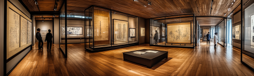 A hyper-realistic, innovative exhibition in a rectangular room with warm wooden floors. The exhibit is dynamic and visually captivating, showcasing a range of paper-based art forms--sketches, traditional Chinese ink paintings, photographs, historical documents, and more. The space uses soft, ambient lighting to highlight the textures and details of each piece. Strategic placement of modern, interactive display panels and transparent frames creates a flow that encourages movement through the room, while minimalistic decor draws full attention to the art --ar 10:3 --v 6.1