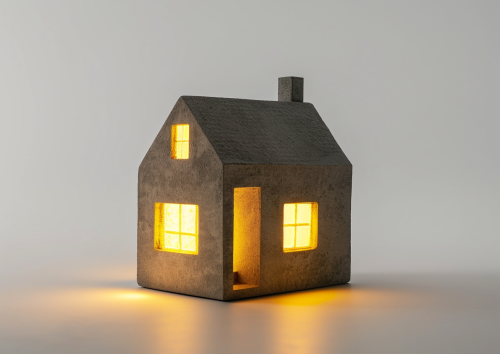 small cosy house, symbolic, yellow lights in window, from outside, empty white background, minimalistic --ar 7:5 --v 6.0