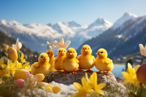a large 3d question mark is made from chocolate. many happy small easter chicks in a cartoon style. colorful easter eggs. snowy landscape. yellow crocus. sunshine. distant snowy mountains. bokeh. --ar 3:2