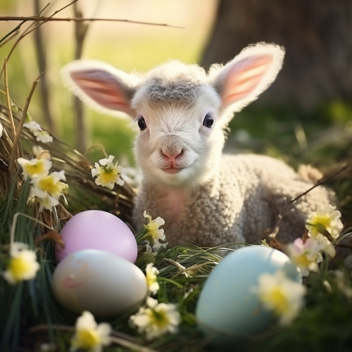 Create a high-resolution, vibrant image depicting an Easter morning celebration. The scene is set in a bright, sunny backyard with lush green grass and blooming flowers in soft pastel colors. In the foreground, there's a family with two children, joyfully engaged in an Easter egg hunt. The kids, one boy and one girl, are wearing casual spring attire with festive Easter hats. They are excitedly picking colorful, decorated eggs from the grass and placing them in their wicker baskets.In the background, a wooden picnic table is adorned with Easter decorations, including a pastel-colored tablecloth, a vase of fresh spring flowers, and a plate of Easter treats like chocolate bunnies and hot cross buns. An Easter banner with 'Happy Easter' written in cheerful lettering hangs above the table.To the side, a small, fluffy, white bunny is playfully hopping around, adding to the festive atmosphere. The sun is shining brightly, casting a warm, golden glow over the entire scene, and there's a feeling of joy and family togetherness. The image should be in the style of stock photography, suitable for use in a family magazine or Easter greeting card."This prompt is designed to encapsulate the warmth, family fun, and festive spirit of Easter morning, while avoiding any specific trademarks or copyrighted elements. The focus on generic yet recognizable symbols of Easter ensures the image stays within the boundaries of a stock footage style. --s 750 --v 6.0 --style raw