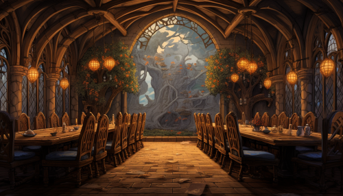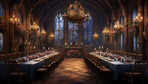 illustration of a hall in a fantasy castle, with a long table set up for a meeting at dinner --c 10 --ar 7:4