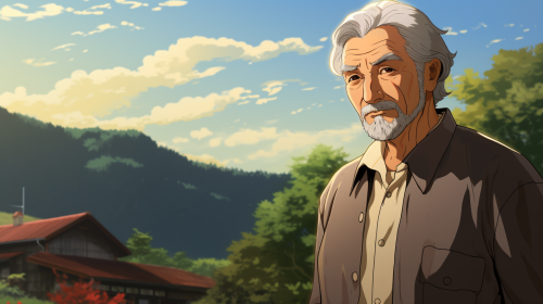 A gentle and wise grandfather, sliver hair, a little dark skin by the sun, wearing ivory shirt and olive pant, live in countryside, ghibli art style, character, front back side pose --ar 16:9