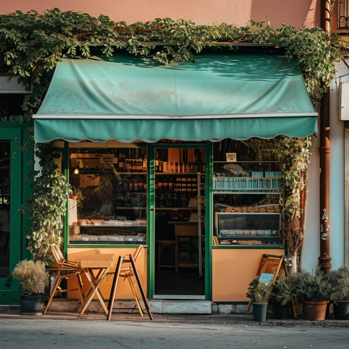 A shop with a green awning on the background that can be used in greenbox technology--ar 16:9 --v 6.0