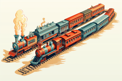 long train cartoonish drawing with different kinds of carriage in isometric view, --ar 3:2