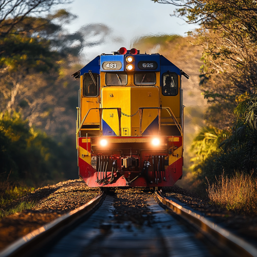 realistic photo of a modern locomotive, traveling through a Latin American landscape, seen from the front, with the colors yellow, blue and red. 50mm F/1.8