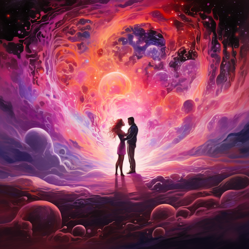 In a fantastical realm of science fiction, Valentine's Day takes on an otherworldly essence filled with love and magic. This vibrant image, perhaps a digitally rendered painting, captures the heart of the occasion. With vivid hues of pinks and purples, the scene shows two celestial beings embracing, their ethereal forms entwined in a tender embrace. Time seems to stand still as stars twinkle in the background, adding a sense of enchantment to the composition. The intricate details of their radiant robes, adorned with shimmering hearts, convey passion and affection. The image emanates a captivating quality, where love transcends the ordinary and weaves a story of cosmic romance. --v 5.2