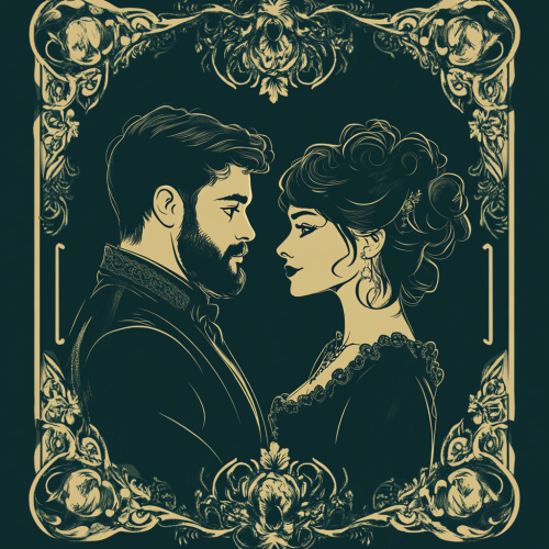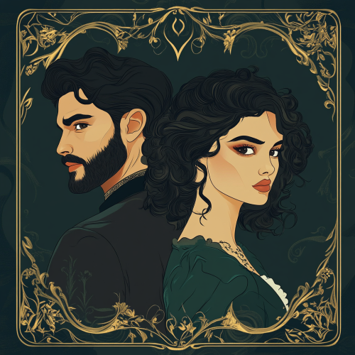 vector style back of playing cards elegant and ornate beautiful romantic couple as the subject dark forest green. Mid 20s couple man with dark hair and a beard and woman with dark curly hair