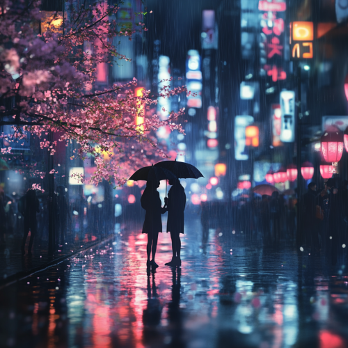 A romantic, cinematic scene of two characters standing in the rain under glowing streetlights, with umbrellas and soft light reflecting off the wet streets. The mood is bittersweet and emotional, capturing the heart-tugging feelings of a classic Kdrama moment. In the background, a city skyline fades into the night, with soft, blurred neon signs glowing in the distance. Cherry blossoms gently float in the air, adding a touch of elegance. The overall atmosphere is dreamy, emotional, and filled with nostalgia, evoking the warmth and sentimentality of Kdrama soundtracks. Make it Photorealistic