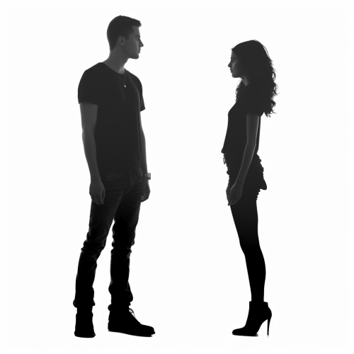 silhouettes of a man and a woman in love positions, standing, waman in skinny clothes with narrow waist, flat image, black and white, full-length images of people