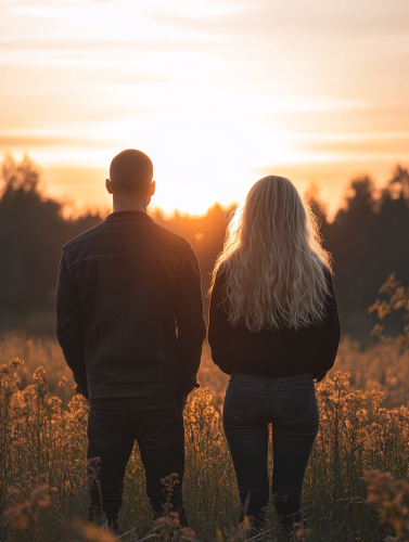 man with buzz cut hair and woman with long blonde hair couple wearing black shoes standing in front of sunset facing away from camera, romantic, normal looking people, not models, full body in frame, realistic, photography, shot with a Nikon Z7 II, 50mm f/1.4 lens, natural soft tones --ar 3:4 --style raw --v 6.1