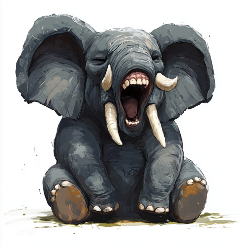 african elphant with big ears and two tusks, seated, lauging with excitement, vector image for illustration, painted style, also like cartoon style, white background