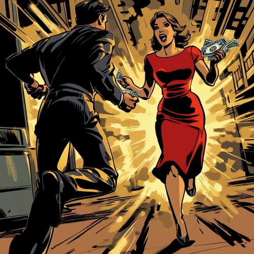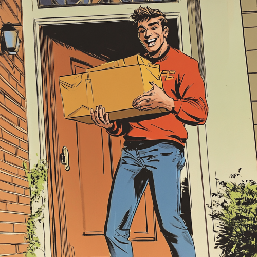 a comic book style drawing of a man standing at his front door, looking at a massive package with an immense amount of excitement and enthusiasm, comic book style drawing, cool, happy