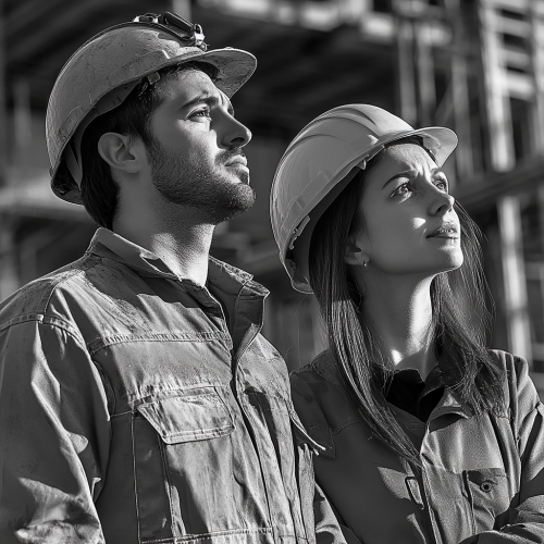 photo of multicultural construction workers man and woman with profesional clothes and helmet in the construction look at the front backround photo black and white