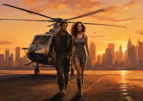 the back of a couple on a aerodrome, they wear casual clothes, the girl has brown eyes and brown hair, the guy has brown eyes and brown hair, both holding their pilot helmet in their hands, both holding hands. they are walking to a helicopter who is standing in the background, new york skyline in the background by sundown, they are happy and excited --ar 7:5