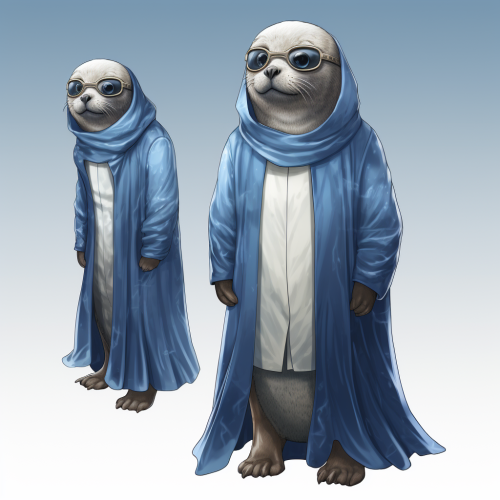 the character of a seal (the animal) with blue glasses, faith and courageous facial expression and blue eyes, full body expression, illustration for a anime book, full-color, Hiromu Arakawa anime style