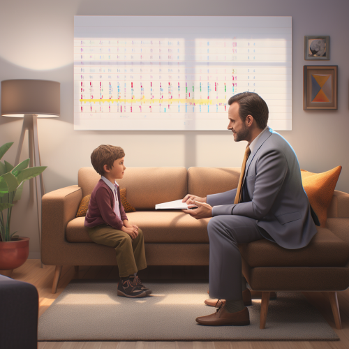 psychologyst working with 6-year-old boy who is sitting on a couch in a modern office with light colored walls. ultra realistic. --s 50