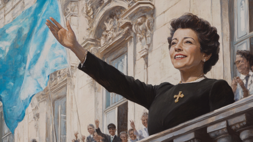 A painting of a woman in her forties, with a high hairstyle, waving from the balcony with courage. She is wearing a simple and close black dress from the 70s and a small gold-plated catholic cross on the neck. The scene captures her decision and successful political career, in front of a classic building with a light blue and white flag. In the background, we see people cheering. --ar 16:9