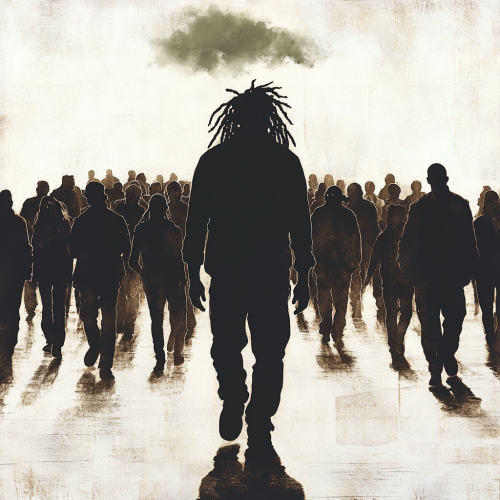 In a realistic crowd of warm people walking up and down the sidewalk there is a man who is dead center separating the two crowds. This man is the only dark silhouetted figure in the image. He’s an African America male Slightly overweight with a height of 6’2 and has 14 inch dreadlocks that has caused a huge divide because he is purposely keeping his distance from the crowd, He also has a small figurative cloud over his head alone that is snowing