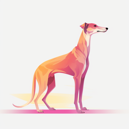 Cartoon illustration side view of a straight standing greyhound on 4 paws side view, pink and orange greyhound, on all 4 paws, side view - standing straight, the dog must stand straight, on a pedestal. Side view. Premium illustration drawing, white background, fancy, cool, minimalist, colorful, premium design, intense colors, comic style.
