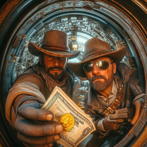 photorealistic wide angle selfie of cowboys robbing a vault on wild west they are inside a vault in a bank and one of them is holding gold bars and the other one a lot of cash