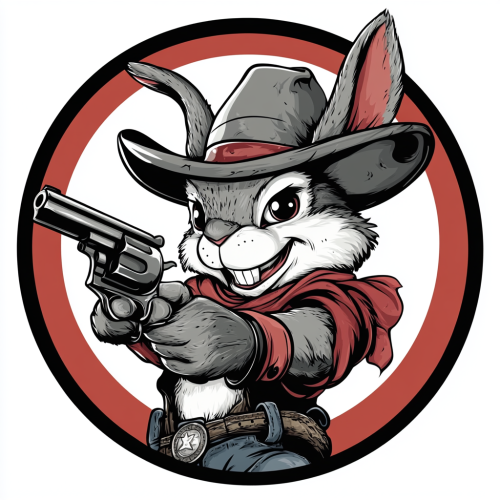 In a sharp, modern vector style logo for an Americana rock band, illustrate a sweet, soft, kind rabbit with a wry mischievous smile holding a loaded revolver / gun in such a way that its barrell is sticking out of the space of the circle, breaking the 4th wall, within a circle on an isolated white background