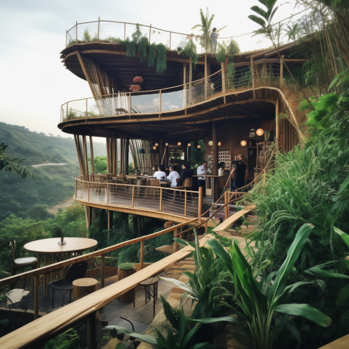 bamboo coffee shop on the hillside with long side of the building facing downhill