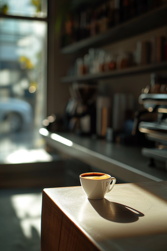 a coffee cup with clouds on the side sitting on a natural whte oak table in a spacious and modern coffee shop