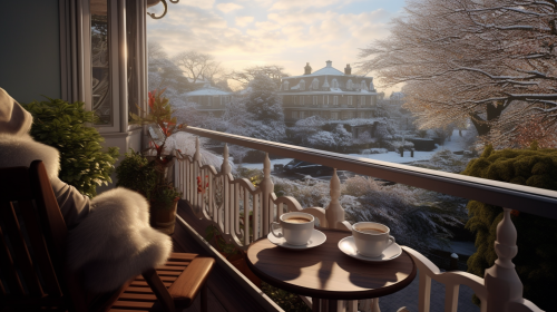 relaxing in balcony overlooking garden with fireplace over coffee in winter --no fire in fireplace --ar 16:9