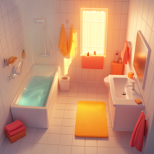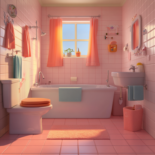 A clean and tidy bathroom, with a bright, fully functioning light. The showerhead is perfectly installed, with no leaks or water splashing. Towels are neatly hanging on a sturdy towel rack. The overall atmosphere is warm, inviting, and well-lit, creating a sense of comfort and cleanliness. 3D cartoon disney style. --v 6.1