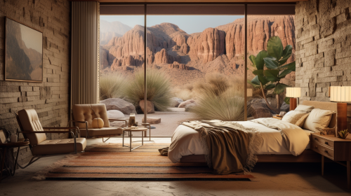 A desert themed mid-century modern BEDROOM with cozy dim lamp lighting. Photorealistic, hyperrealism, intricate detail, super sharp, wide angle lens, --ar 16:9