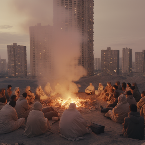 hd hyper realistic African American men with beards dressed in biblical garments laughing with African American women dressed in biblical garments modest laughing outside --ar 16:9 --v 5.2