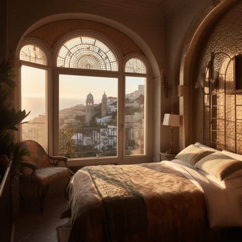 A cozy bedroom during the day, filled with warm, natural light streaming through a large window. The window offers a stunning, panoramic view of a large coastal city with a hot Mediterranean climate and a rugged, rocky terrain. The cityscape is dominated by architecture that blends southern Italian and West African influences, with buildings featuring sun-baked, earthy tones, vibrant facades, and intricate designs. The city sprawls across hills and cliffs, with a backdrop of the vast, deep blue ocean and a landscape covered in maquis vegetation. The interior of the room is comfortably furnished, but the focus remains on the atmospheric, mood-setting view of this unique and culturally rich city, bathed in the golden light of the sun. --v 5.0