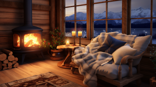 wooden stove + fabric sofa with pillows + big beautiful window, cozy evening winter cabin interior, ultra photorealistic + 8k + cinematic + very realistic, unreal engine 5, 3d max render --ar 16:9 --s 50