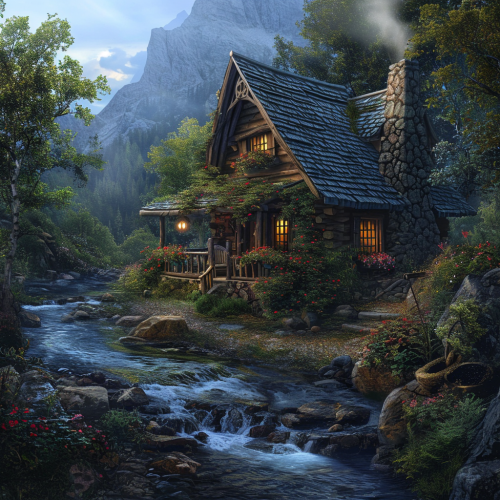 fantasy setting, small stream, picturesque log cabin, front porch with flower boxes, a thin ribbon of smoke coming from the chimney, near the woods, a mountain looming in the distance --style raw --v 6.0