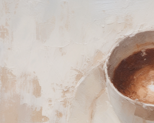 Modern and rustic cafe interior with wooden tables, white walls and mockup poster frame on the wall. The space is filled with natural light and neutral colors to create a cozy atmosphere. Close-up of boho-style decorations, including a round wooden table top, a vase with dried grass, a coffee mug, and a teapot, adding a warm home décor. It's attractive and artistic --ar 2:3 --s 300