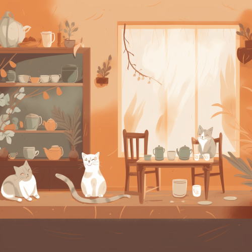a warm, spacious interior with an everyday feel, in warm colors, with a black cat resting somewhere in the background. There's a young girl working somewhere in the background. The overall style should be manga style. 16*9Size, Maximum resolution. Don't have any borders or white space around it. Don't have any borders or white space around it. Only one chandelier on the ceiling. --s 750