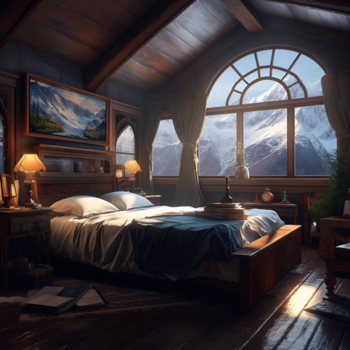 Picture a small cabin interior bedroom that feels like a cozy woodland escape. Dark wood tones, plush textiles, and warm lighting should create an enveloping atmosphere. The bed should be luxurious and inviting, with heavy blankets and soft pillows. Decorations like a faux fur rug and lantern-style lights can enhance the woodland theme. The photograph should capture the coziness of the room, focusing on the rich textures and warm colors that make it a perfect retreat. Neat and organized. Camera: DSLR - Canon EOS 5D Mark IV. Lens: Canon EF 24-70mm f/2.8L II USM. Composition: Wide shot, room-centered, horizontal orientation, balance between furniture and space. Film: Digital, high resolution, color profile sRGB. Camera settings: ISO 400, f/2.8, 1/60 sec. --ar 2:3 --v 6.1 --s 250