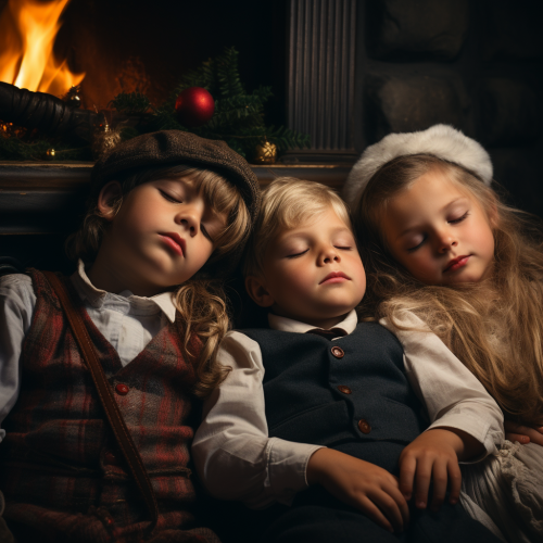 A child in cozy winter pajamas sits on the floor next to a beautifully decorated Christmas tree decorated with traditional Polish decorations such as glass baubles and straw stars. A happy 7-year-old child unwraps a gift - a transparent small jar filled with colorful jelly beans in the shape of Christmas trees and candy canes. The jar is decorated with a red ribbon. The room is filled with warm, delicate lighting, and Christmas decorations, including garlands and fairy tales, enhance the festive atmosphere. There is a fireplace burning in the background, which adds a cozy and warm character to the scene --ar 4:3 --s 50 --v 6.0
