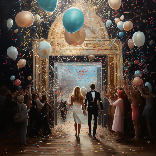 1200 dpi oil painting high end art a Nipsey Hussle looking back at the viewer giving a thumbs up as he walks up a golden stairway lined with light blue clouds ending at pearlescent gates, Jesus is standing there with arms extended in welcome. background of white fluffy clouds. centered emotionalism.