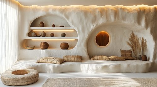 A white wall with shelves, mid-centurydecor and soft lighting. In the center of one shelf is an arch-shaped hole for a vase or sculpture. The walls have organic shapes, and there are some natural wood elements on top of them. There are also two cushions in front of it. This room has warm tones, natural materials like clay pots, vases, and wooden details, and has a cozy atmosphere. It's a very calm space with a lot of light and shadows. --ar 16:9 --v 6.1 --s 750