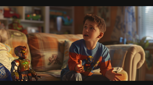 photorealistic image of a child, age 7, in his home living room speaking directly to an action figure toy which appears to be speaking to the child. Ambiance of the image is one of fun childhood, imaginative play, and positivity. --ar 16:9